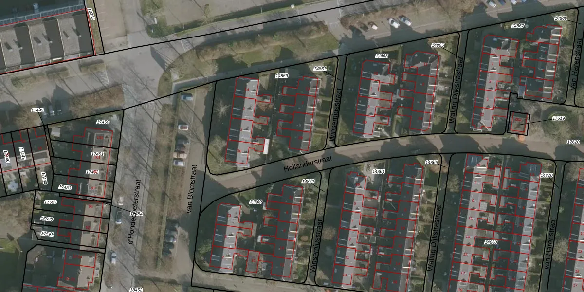 Hollanderstraat 28 is gelegen op kadastraal perceel LWD00G14859. Deze kadastrale aanduiding is uniek en wordt gebruikt door het Kadaster om eigendomsrechten en andere zakelijke rechten vast te leggen. Het perceel maakt onderdeel uit van de kadastrale gemeente Leeuwarden.