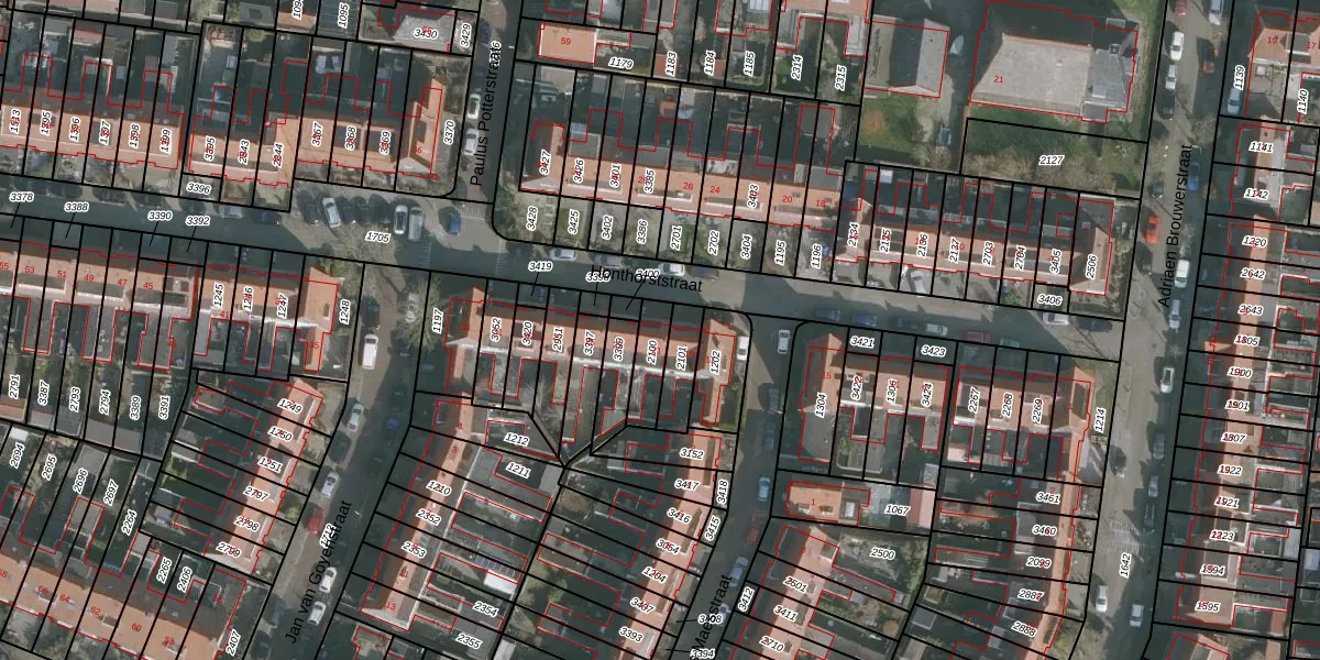 Het perceel waarop Honthorststraat 21 staat heeft een oppervlakte van 91 m². Dit is een klein perceel. De perceeloppervlakte wordt geregistreerd door het Kadaster. Gedetailleerde informatie over de maten van dit perceel kunt u vinden in het rapport Kadastrale kaart met maatvoering van Honthorststraat 21.