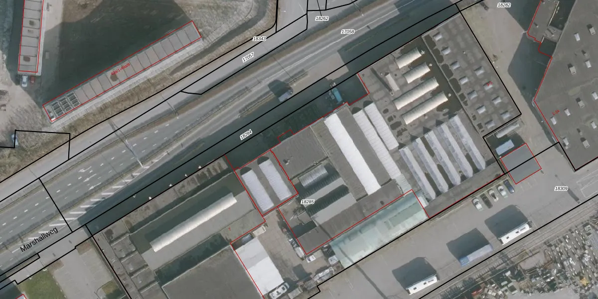 Het perceel waarop Marshallweg 5 staat heeft een oppervlakte van 7607 m². Dit is een zeer groot perceel. De perceeloppervlakte wordt geregistreerd door het Kadaster. Gedetailleerde informatie over de maten van dit perceel kunt u vinden in het rapport Kadastrale kaart met maatvoering van Marshallweg 5.