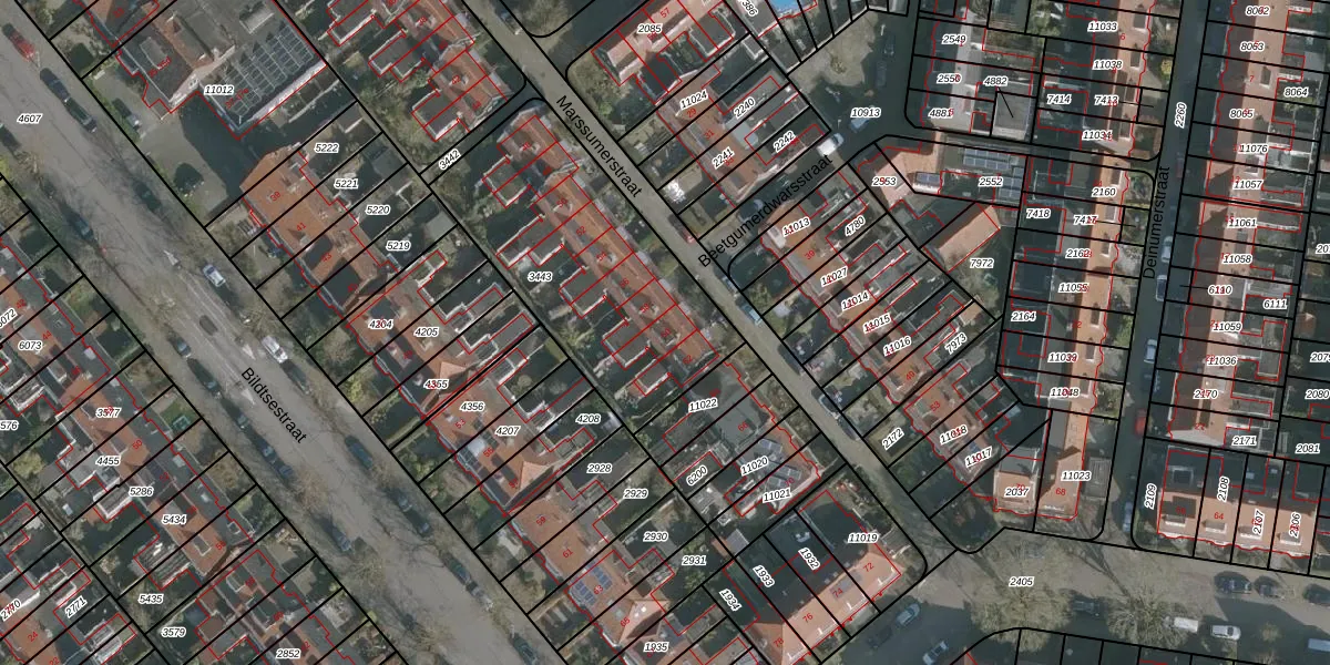 Het perceel waarop Marssumerstraat 60 staat heeft een oppervlakte van 1072 m². Dit is een zeer groot perceel. De perceeloppervlakte wordt geregistreerd door het Kadaster. Gedetailleerde informatie over de maten van dit perceel kunt u vinden in het rapport Kadastrale kaart met maatvoering van Marssumerstraat 60.