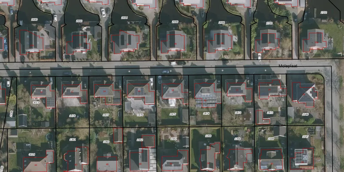 Het perceel waarop Moleplaat 18 staat heeft een oppervlakte van 573 m². Dit is een groot perceel. De perceeloppervlakte wordt geregistreerd door het Kadaster. Gedetailleerde informatie over de maten van dit perceel kunt u vinden in het rapport Kadastrale kaart met maatvoering van Moleplaat 18.