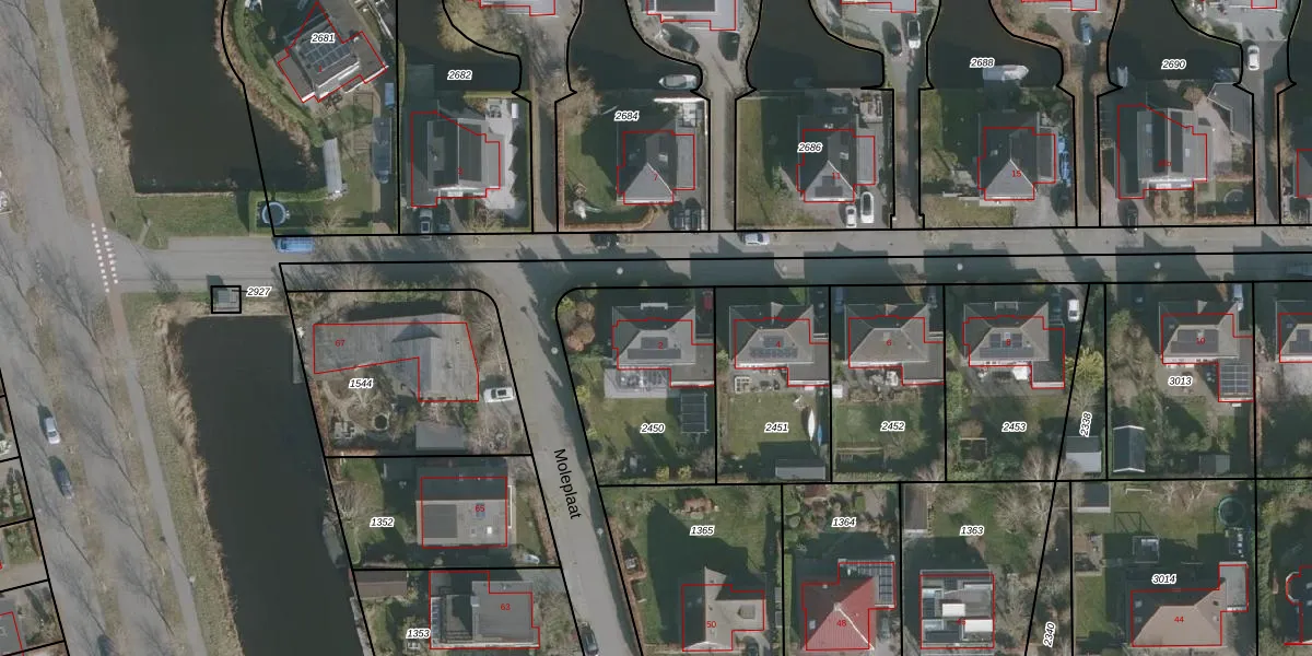 Het perceel waarop Moleplaat 2 staat heeft een oppervlakte van 647 m². Dit is een groot perceel. De perceeloppervlakte wordt geregistreerd door het Kadaster. Gedetailleerde informatie over de maten van dit perceel kunt u vinden in het rapport Kadastrale kaart met maatvoering van Moleplaat 2.