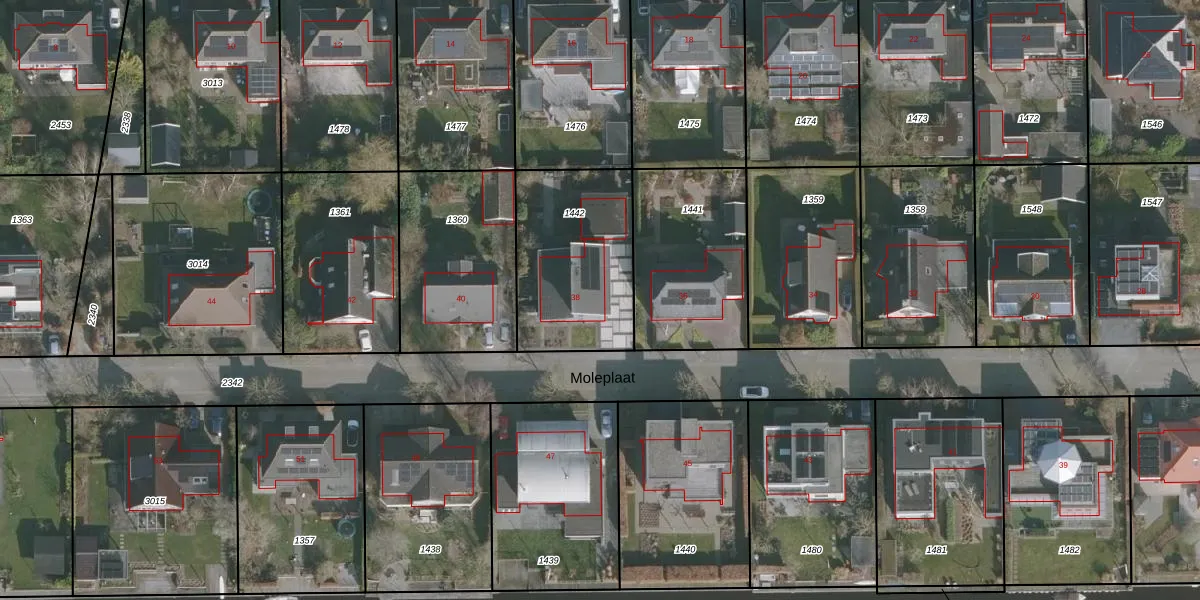 Het perceel waarop Moleplaat 38 staat heeft een oppervlakte van 590 m². Dit is een groot perceel. De perceeloppervlakte wordt geregistreerd door het Kadaster. Gedetailleerde informatie over de maten van dit perceel kunt u vinden in het rapport Kadastrale kaart met maatvoering van Moleplaat 38.
