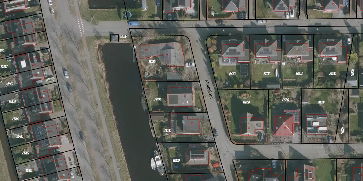 Het perceel waarop Moleplaat 65 staat heeft een oppervlakte van 547 m². Dit is een groot perceel. De perceeloppervlakte wordt geregistreerd door het Kadaster. Gedetailleerde informatie over de maten van dit perceel kunt u vinden in het rapport Kadastrale kaart met maatvoering van Moleplaat 65.