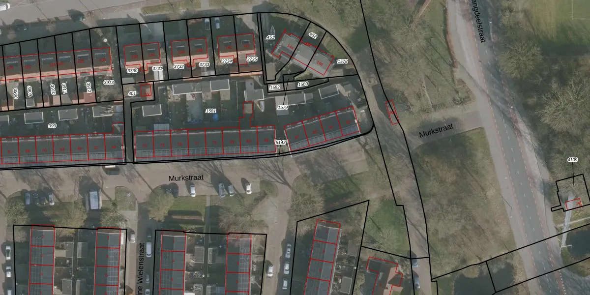 Het perceel waarop Murkstraat 87 staat heeft een oppervlakte van 1957 m². Dit is een zeer groot perceel. De perceeloppervlakte wordt geregistreerd door het Kadaster. Gedetailleerde informatie over de maten van dit perceel kunt u vinden in het rapport Kadastrale kaart met maatvoering van Murkstraat 87.