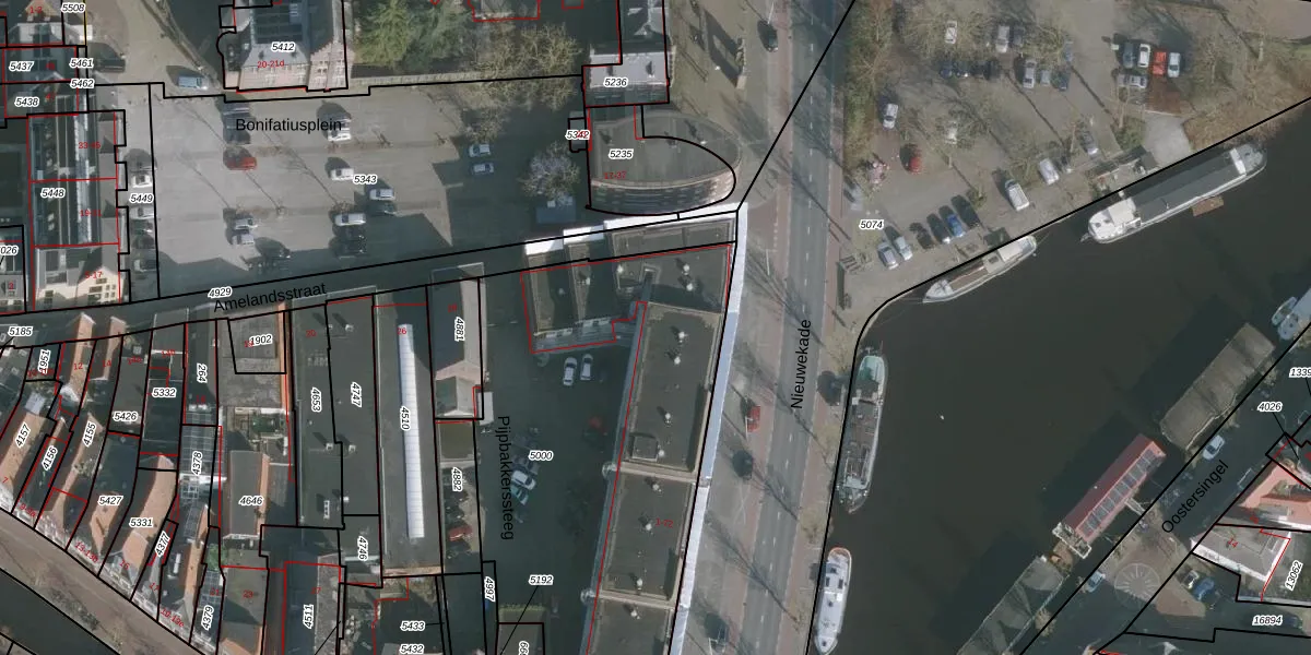 Het perceel waarop Nieuwekade 22 staat heeft een oppervlakte van 2161 m². Dit is een zeer groot perceel. De perceeloppervlakte wordt geregistreerd door het Kadaster. Gedetailleerde informatie over de maten van dit perceel kunt u vinden in het rapport Kadastrale kaart met maatvoering van Nieuwekade 22.