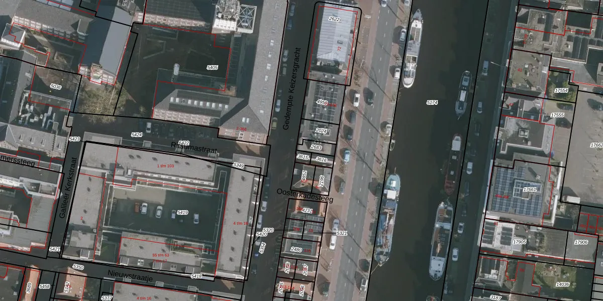 Het perceel waarop Oosterkade 100 staat heeft een oppervlakte van 55 m². Dit is een klein perceel. De perceeloppervlakte wordt geregistreerd door het Kadaster. Gedetailleerde informatie over de maten van dit perceel kunt u vinden in het rapport Kadastrale kaart met maatvoering van Oosterkade 100.