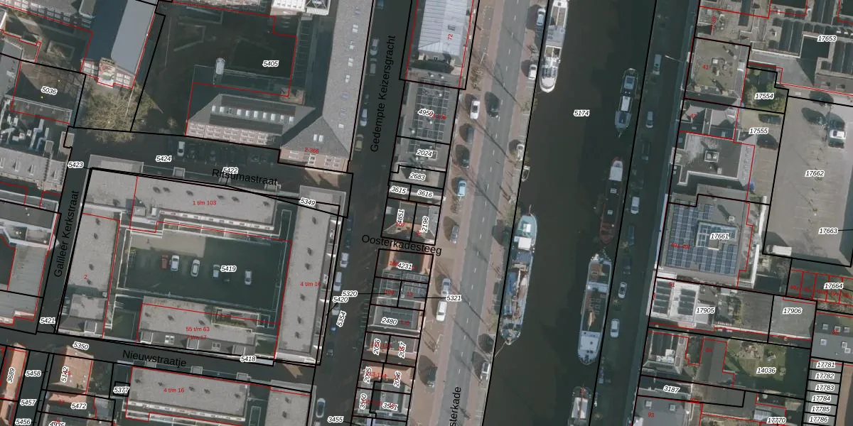 Het perceel waarop Oosterkade 107-a staat heeft een oppervlakte van 50 m². Dit is een klein perceel. De perceeloppervlakte wordt geregistreerd door het Kadaster. Gedetailleerde informatie over de maten van dit perceel kunt u vinden in het rapport Kadastrale kaart met maatvoering van Oosterkade 107-a.