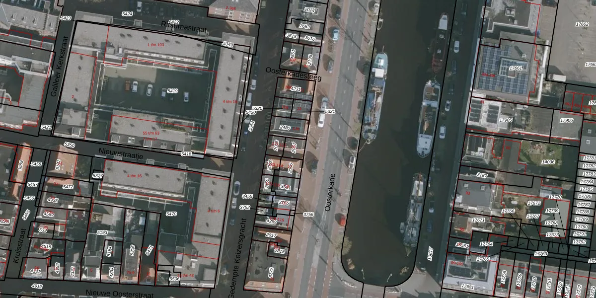 Het perceel waarop Oosterkade 112 staat heeft een oppervlakte van 44 m². Dit is een klein perceel. De perceeloppervlakte wordt geregistreerd door het Kadaster. Gedetailleerde informatie over de maten van dit perceel kunt u vinden in het rapport Kadastrale kaart met maatvoering van Oosterkade 112.