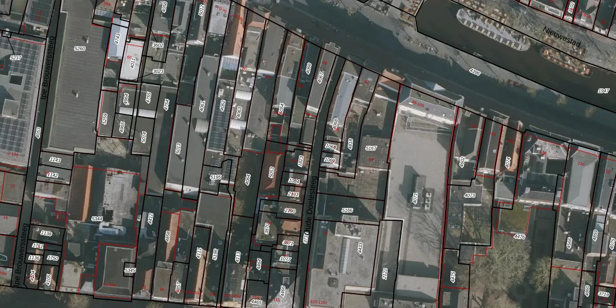 Het perceel waarop Oude Doelesteeg 2 staat heeft een oppervlakte van 53 m². Dit is een klein perceel. De perceeloppervlakte wordt geregistreerd door het Kadaster. Gedetailleerde informatie over de maten van dit perceel kunt u vinden in het rapport Kadastrale kaart met maatvoering van Oude Doelesteeg 2.
