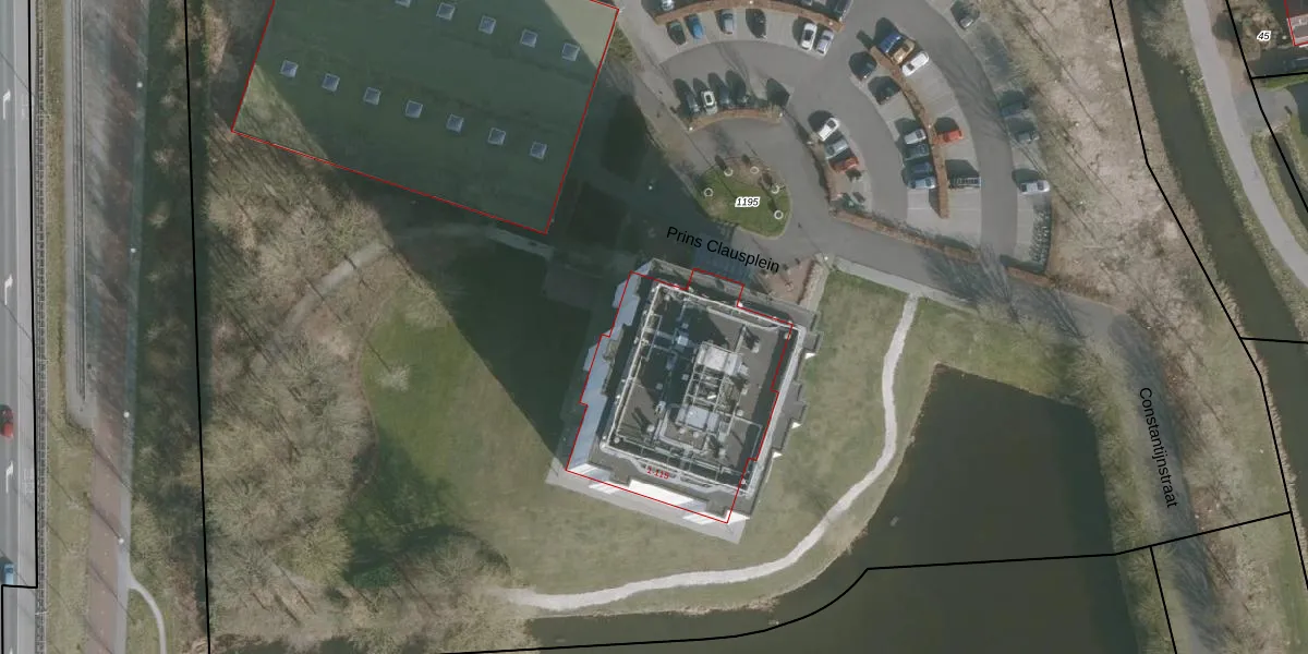 Het perceel waarop Prins Clausplein 21 staat heeft een oppervlakte van 1,8 ha. Dit is een zeer groot perceel. De perceeloppervlakte wordt geregistreerd door het Kadaster. Gedetailleerde informatie over de maten van dit perceel kunt u vinden in het rapport Kadastrale kaart met maatvoering van Prins Clausplein 21.