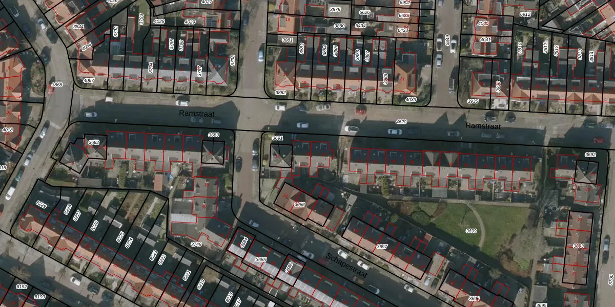 Het perceel waarop Ramstraat 18 staat heeft een oppervlakte van 4421 m². Dit is een zeer groot perceel. De perceeloppervlakte wordt geregistreerd door het Kadaster. Gedetailleerde informatie over de maten van dit perceel kunt u vinden in het rapport Kadastrale kaart met maatvoering van Ramstraat 18.