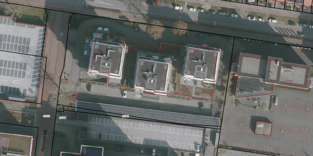 Het perceel waarop Reviusstraat 65 staat heeft een oppervlakte van 6336 m². Dit is een zeer groot perceel. De perceeloppervlakte wordt geregistreerd door het Kadaster. Gedetailleerde informatie over de maten van dit perceel kunt u vinden in het rapport Kadastrale kaart met maatvoering van Reviusstraat 65.