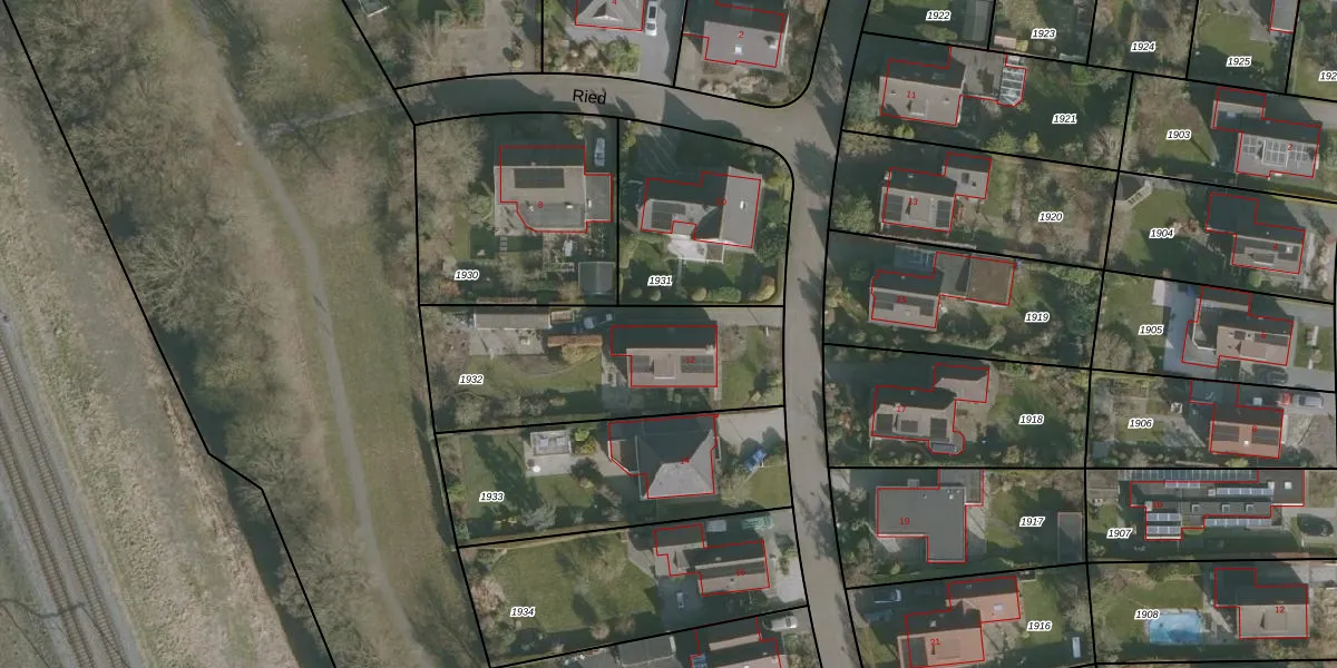 Het perceel waarop Ried 12 staat heeft een oppervlakte van 912 m². Dit is een groot perceel. De perceeloppervlakte wordt geregistreerd door het Kadaster. Gedetailleerde informatie over de maten van dit perceel kunt u vinden in het rapport Kadastrale kaart met maatvoering van Ried 12.