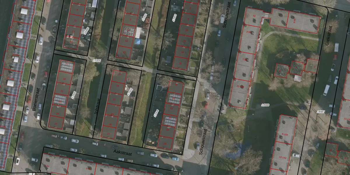 Het perceel waarop Schouwstraat 18 staat heeft een oppervlakte van 995 m². Dit is een groot perceel. De perceeloppervlakte wordt geregistreerd door het Kadaster. Gedetailleerde informatie over de maten van dit perceel kunt u vinden in het rapport Kadastrale kaart met maatvoering van Schouwstraat 18.
