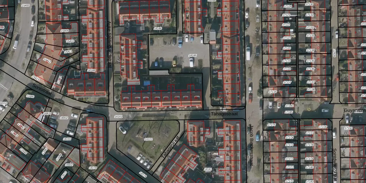 Tabagostraat 21 is gelegen op kadastraal perceel LWD00G18186. Deze kadastrale aanduiding is uniek en wordt gebruikt door het Kadaster om eigendomsrechten en andere zakelijke rechten vast te leggen. Het perceel maakt onderdeel uit van de kadastrale gemeente Leeuwarden.