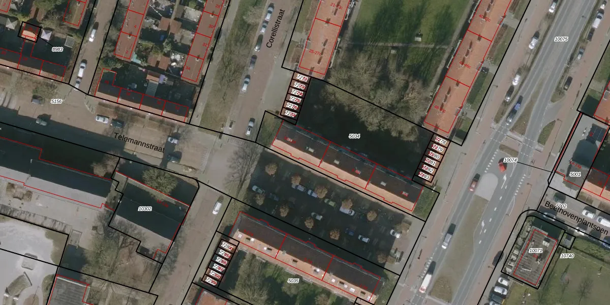 Het perceel waarop Telemannstraat 10-b staat heeft een oppervlakte van 1387 m². Dit is een zeer groot perceel. De perceeloppervlakte wordt geregistreerd door het Kadaster. Gedetailleerde informatie over de maten van dit perceel kunt u vinden in het rapport Kadastrale kaart met maatvoering van Telemannstraat 10-b.