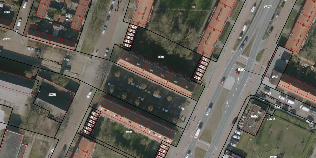 Het perceel waarop Telemannstraat 6 staat heeft een oppervlakte van 1387 m². Dit is een zeer groot perceel. De perceeloppervlakte wordt geregistreerd door het Kadaster. Gedetailleerde informatie over de maten van dit perceel kunt u vinden in het rapport Kadastrale kaart met maatvoering van Telemannstraat 6.