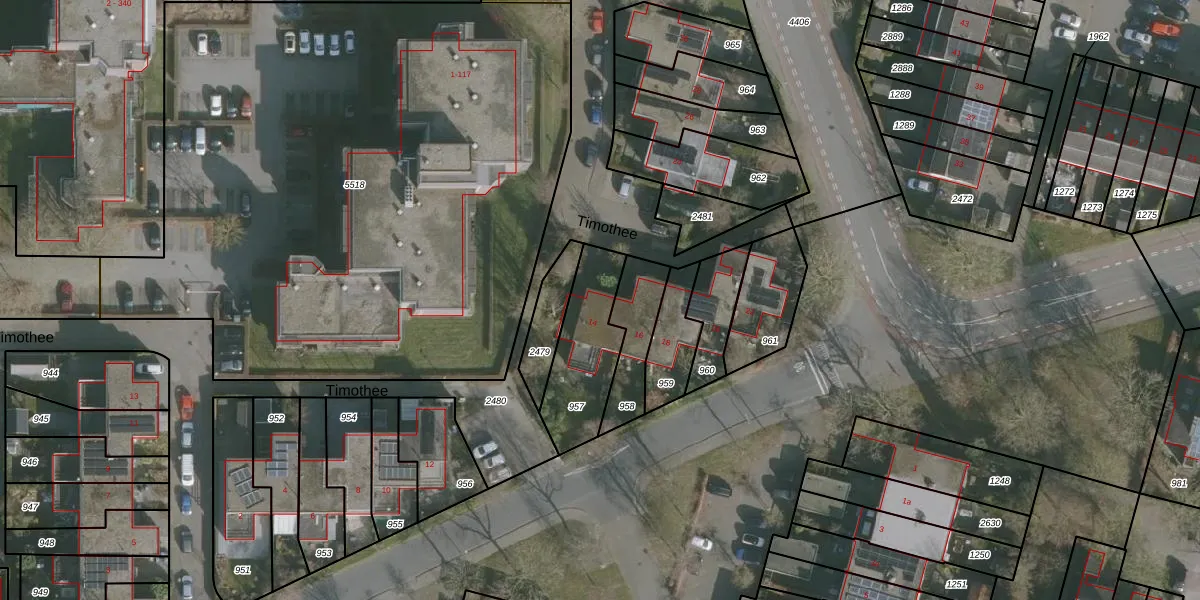 Het perceel waarop Timothee 14 staat heeft een oppervlakte van 306 m². Dit is een groot perceel. De perceeloppervlakte wordt geregistreerd door het Kadaster. Gedetailleerde informatie over de maten van dit perceel kunt u vinden in het rapport Kadastrale kaart met maatvoering van Timothee 14.