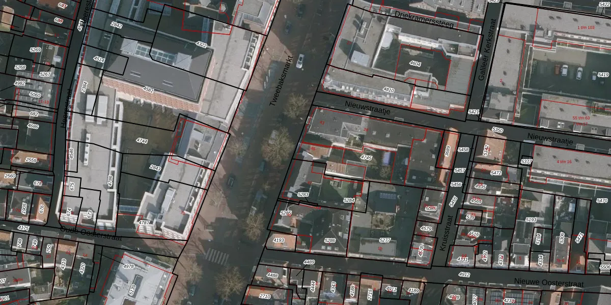Het perceel waarop Tweebaksmarkt 45 staat heeft een oppervlakte van 955 m². Dit is een groot perceel. De perceeloppervlakte wordt geregistreerd door het Kadaster. Gedetailleerde informatie over de maten van dit perceel kunt u vinden in het rapport Kadastrale kaart met maatvoering van Tweebaksmarkt 45.
