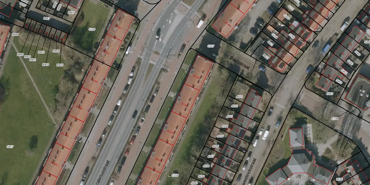 Het perceel waarop Valeriusstraat 37-c staat heeft een oppervlakte van 5275 m². Dit is een zeer groot perceel. De perceeloppervlakte wordt geregistreerd door het Kadaster. Gedetailleerde informatie over de maten van dit perceel kunt u vinden in het rapport Kadastrale kaart met maatvoering van Valeriusstraat 37-c.