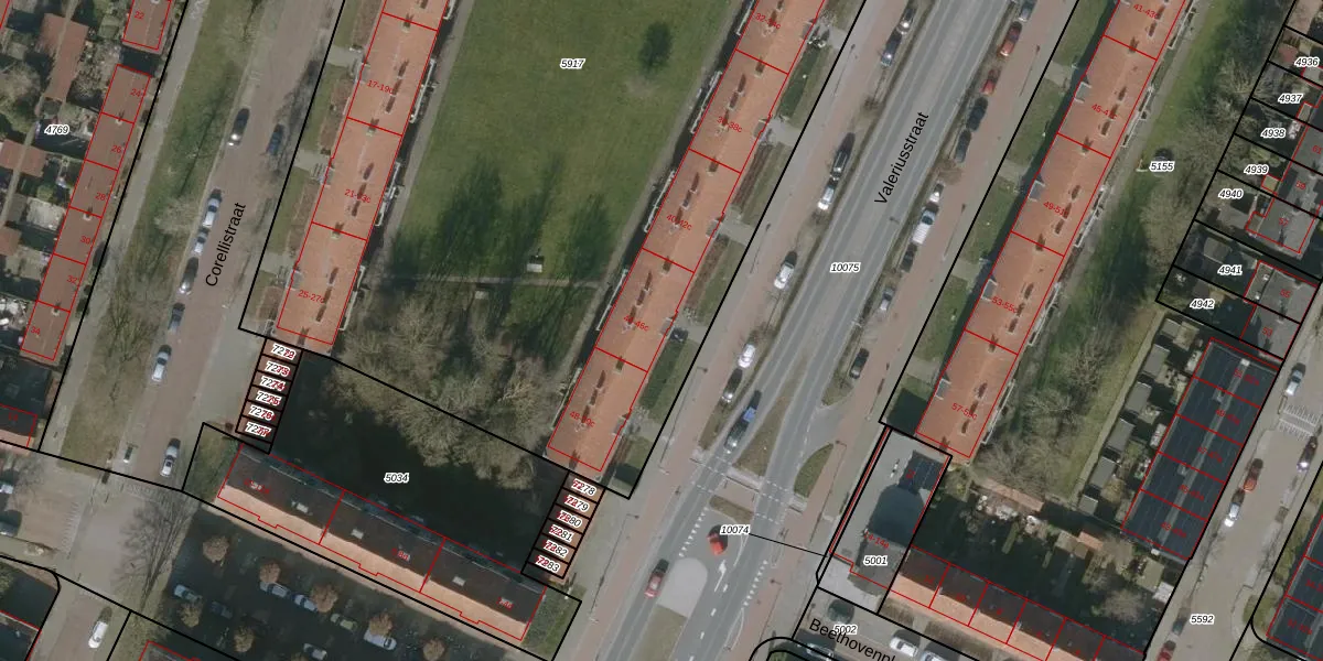 Het perceel waarop Valeriusstraat 46 staat heeft een oppervlakte van 8563 m². Dit is een zeer groot perceel. De perceeloppervlakte wordt geregistreerd door het Kadaster. Gedetailleerde informatie over de maten van dit perceel kunt u vinden in het rapport Kadastrale kaart met maatvoering van Valeriusstraat 46.