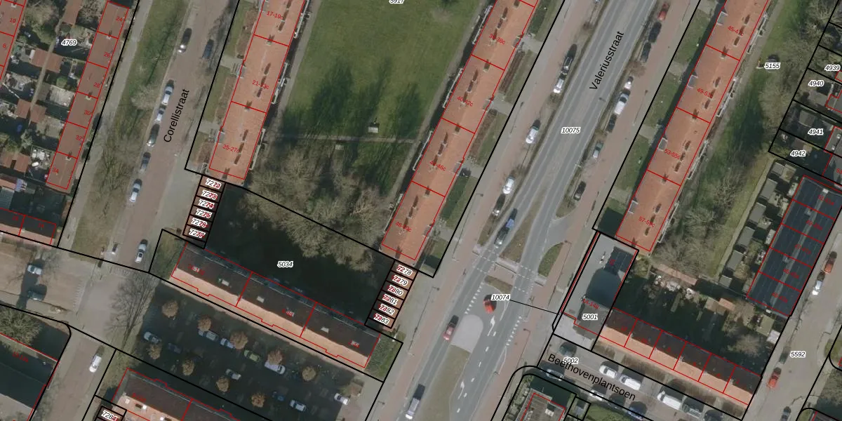Het perceel waarop Valeriusstraat 48-c staat heeft een oppervlakte van 8563 m². Dit is een zeer groot perceel. De perceeloppervlakte wordt geregistreerd door het Kadaster. Gedetailleerde informatie over de maten van dit perceel kunt u vinden in het rapport Kadastrale kaart met maatvoering van Valeriusstraat 48-c.