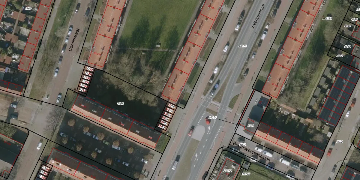 Het perceel waarop Valeriusstraat 50 staat heeft een oppervlakte van 8563 m². Dit is een zeer groot perceel. De perceeloppervlakte wordt geregistreerd door het Kadaster. Gedetailleerde informatie over de maten van dit perceel kunt u vinden in het rapport Kadastrale kaart met maatvoering van Valeriusstraat 50.