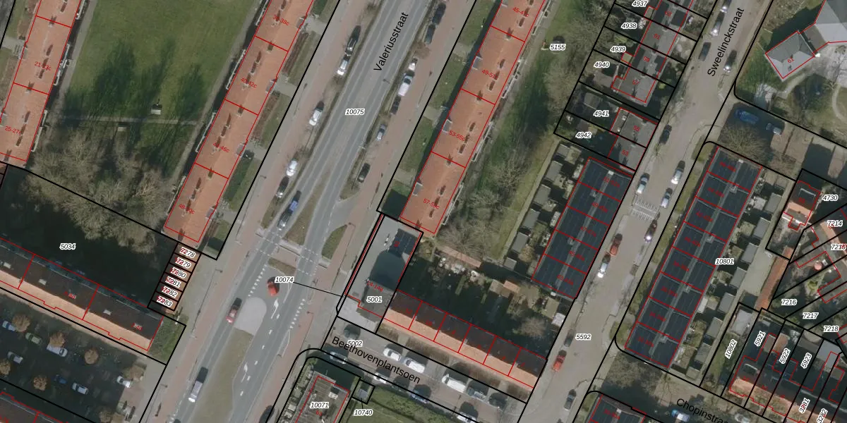 Het perceel waarop Valeriusstraat 59-b staat heeft een oppervlakte van 5275 m². Dit is een zeer groot perceel. De perceeloppervlakte wordt geregistreerd door het Kadaster. Gedetailleerde informatie over de maten van dit perceel kunt u vinden in het rapport Kadastrale kaart met maatvoering van Valeriusstraat 59-b.