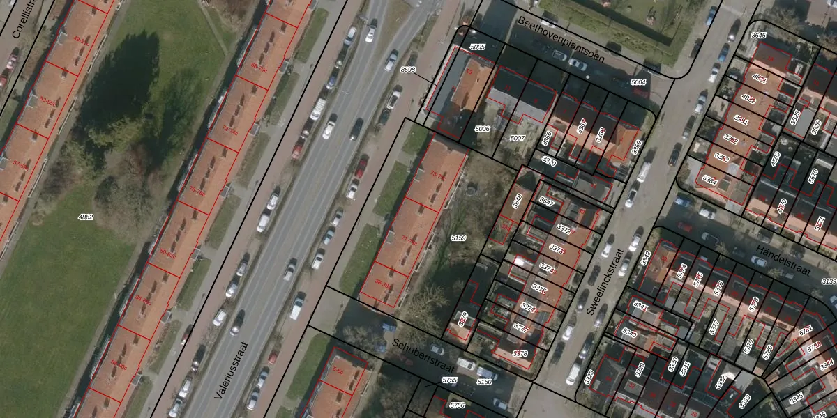 Het perceel waarop Valeriusstraat 77 staat heeft een oppervlakte van 1338 m². Dit is een zeer groot perceel. De perceeloppervlakte wordt geregistreerd door het Kadaster. Gedetailleerde informatie over de maten van dit perceel kunt u vinden in het rapport Kadastrale kaart met maatvoering van Valeriusstraat 77.