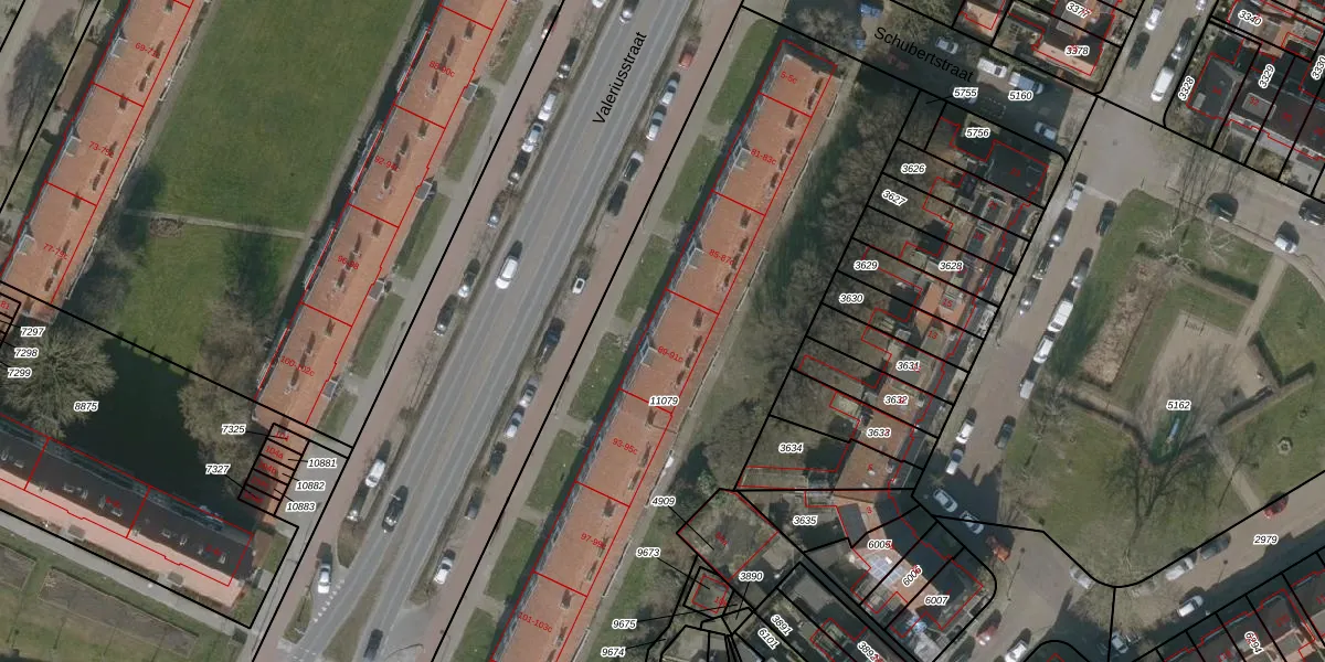 Het perceel waarop Valeriusstraat 89-b staat heeft een oppervlakte van 3530 m². Dit is een zeer groot perceel. De perceeloppervlakte wordt geregistreerd door het Kadaster. Gedetailleerde informatie over de maten van dit perceel kunt u vinden in het rapport Kadastrale kaart met maatvoering van Valeriusstraat 89-b.