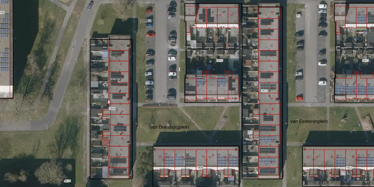Het perceel waarop van Doesburgplein 1 staat heeft een oppervlakte van 1600 m². Dit is een zeer groot perceel. De perceeloppervlakte wordt geregistreerd door het Kadaster. Gedetailleerde informatie over de maten van dit perceel kunt u vinden in het rapport Kadastrale kaart met maatvoering van van Doesburgplein 1.