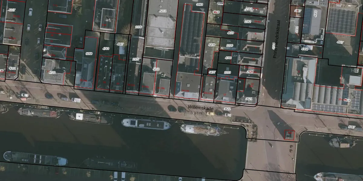 Het perceel waarop Willemskade 14-n staat heeft een oppervlakte van 1053 m². Dit is een zeer groot perceel. De perceeloppervlakte wordt geregistreerd door het Kadaster. Gedetailleerde informatie over de maten van dit perceel kunt u vinden in het rapport Kadastrale kaart met maatvoering van Willemskade 14-n.
