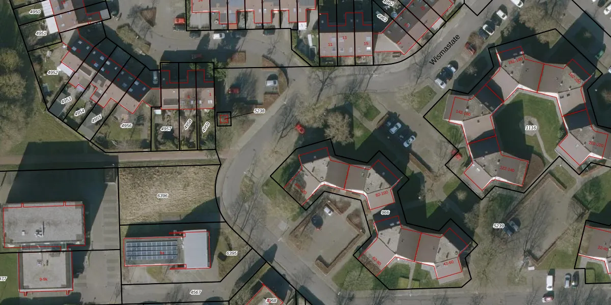 Het perceel waarop Wismastate 102 staat heeft een oppervlakte van 1373 m². Dit is een zeer groot perceel. De perceeloppervlakte wordt geregistreerd door het Kadaster. Gedetailleerde informatie over de maten van dit perceel kunt u vinden in het rapport Kadastrale kaart met maatvoering van Wismastate 102.