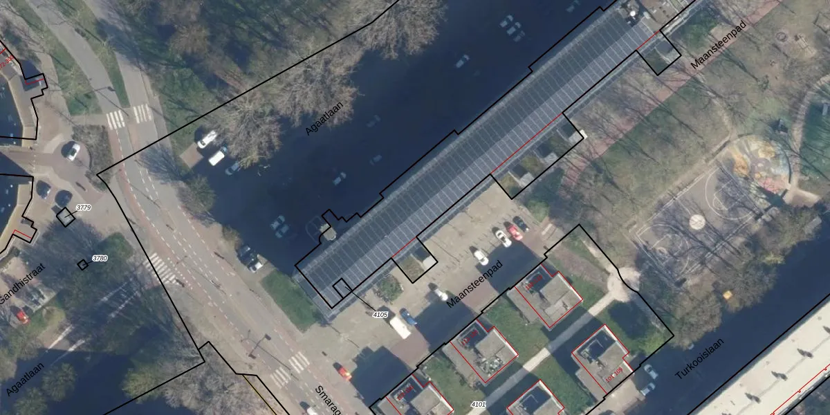 Het perceel waarop Agaatlaan 397 staat heeft een oppervlakte van 4615 m². Dit is een zeer groot perceel. De perceeloppervlakte wordt geregistreerd door het Kadaster. Gedetailleerde informatie over de maten van dit perceel kunt u vinden in het rapport Kadastrale kaart met maatvoering van Agaatlaan 397.