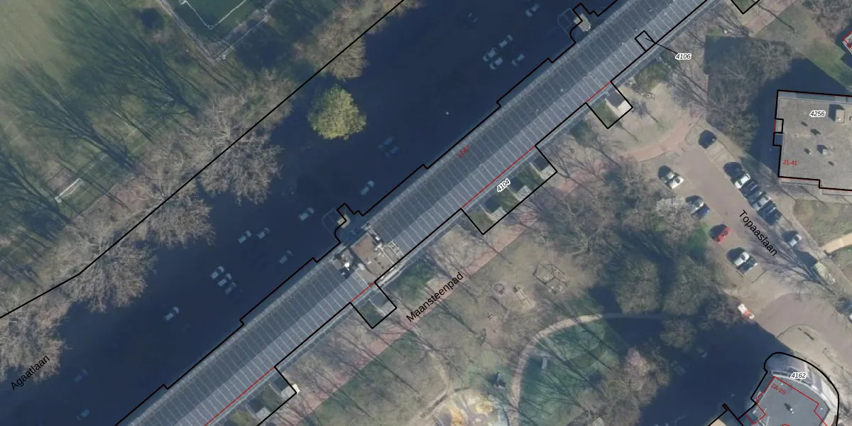 Het perceel waarop Agaatlaan 445 staat heeft een oppervlakte van 4615 m². Dit is een zeer groot perceel. De perceeloppervlakte wordt geregistreerd door het Kadaster. Gedetailleerde informatie over de maten van dit perceel kunt u vinden in het rapport Kadastrale kaart met maatvoering van Agaatlaan 445.
