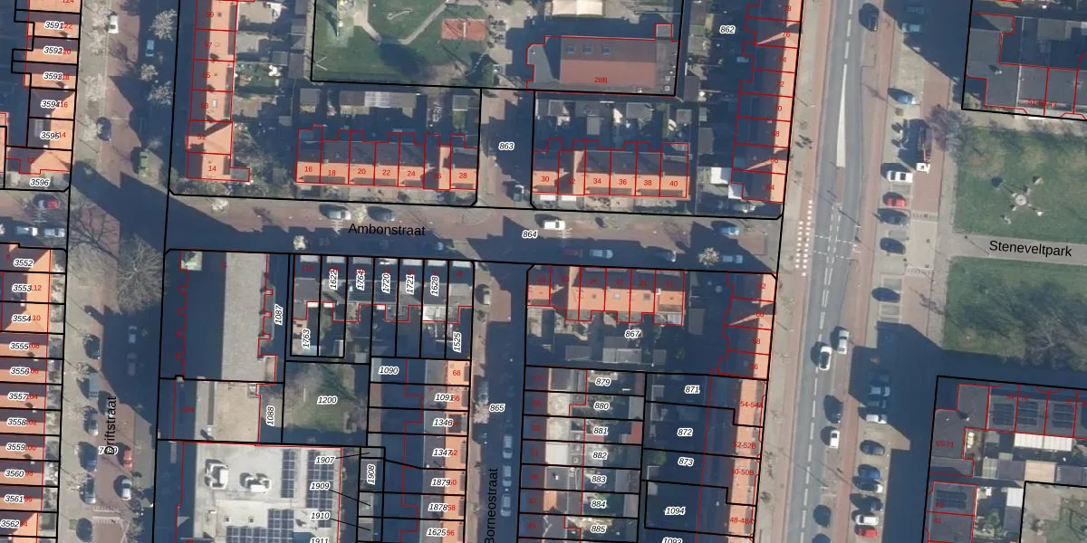 Het perceel waarop Ambonstraat 21 staat heeft een oppervlakte van 866 m². Dit is een groot perceel. De perceeloppervlakte wordt geregistreerd door het Kadaster. Gedetailleerde informatie over de maten van dit perceel kunt u vinden in het rapport Kadastrale kaart met maatvoering van Ambonstraat 21.