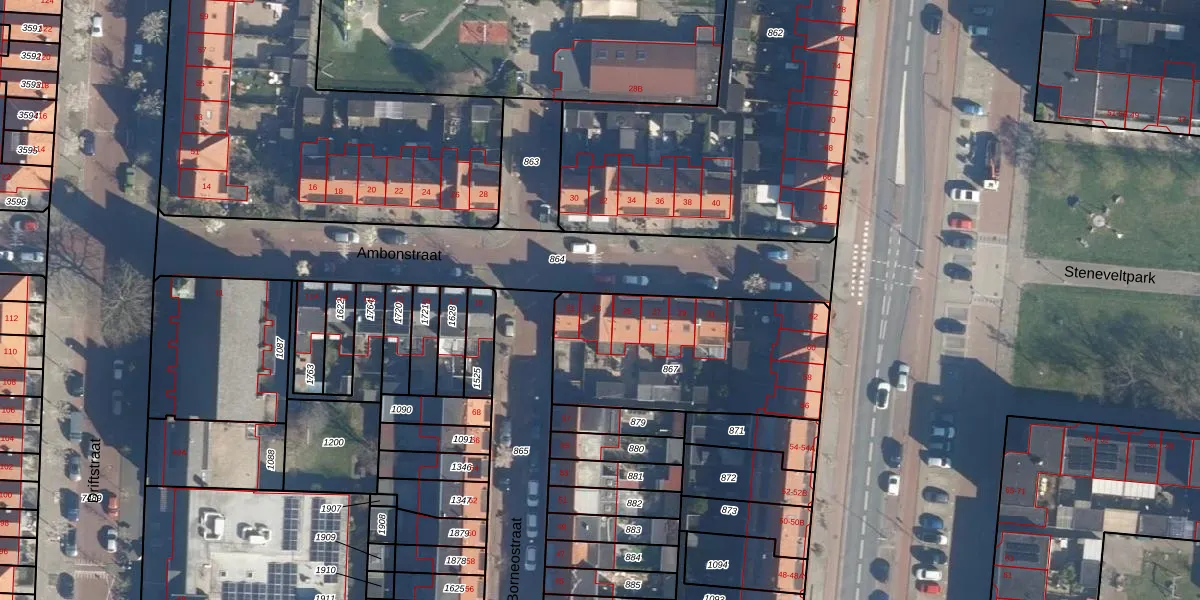Het perceel waarop Ambonstraat 23 staat heeft een oppervlakte van 866 m². Dit is een groot perceel. De perceeloppervlakte wordt geregistreerd door het Kadaster. Gedetailleerde informatie over de maten van dit perceel kunt u vinden in het rapport Kadastrale kaart met maatvoering van Ambonstraat 23.