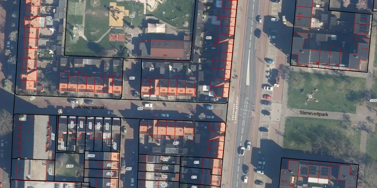 Het perceel waarop Ambonstraat 40 staat heeft een oppervlakte van 1992 m². Dit is een zeer groot perceel. De perceeloppervlakte wordt geregistreerd door het Kadaster. Gedetailleerde informatie over de maten van dit perceel kunt u vinden in het rapport Kadastrale kaart met maatvoering van Ambonstraat 40.