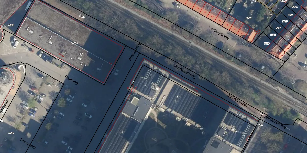 Het perceel waarop Ananasweg 34 staat heeft een oppervlakte van 9449 m². Dit is een zeer groot perceel. De perceeloppervlakte wordt geregistreerd door het Kadaster. Gedetailleerde informatie over de maten van dit perceel kunt u vinden in het rapport Kadastrale kaart met maatvoering van Ananasweg 34.