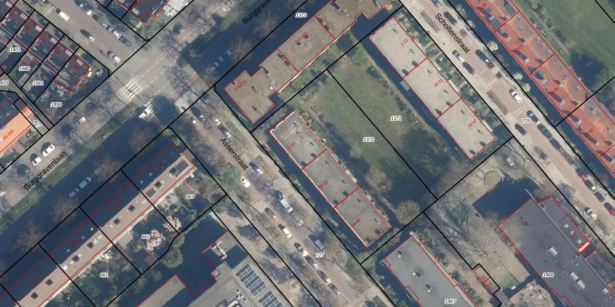Het perceel waarop Asserstraat 14 staat heeft een oppervlakte van 1802 m². Dit is een zeer groot perceel. De perceeloppervlakte wordt geregistreerd door het Kadaster. Gedetailleerde informatie over de maten van dit perceel kunt u vinden in het rapport Kadastrale kaart met maatvoering van Asserstraat 14.