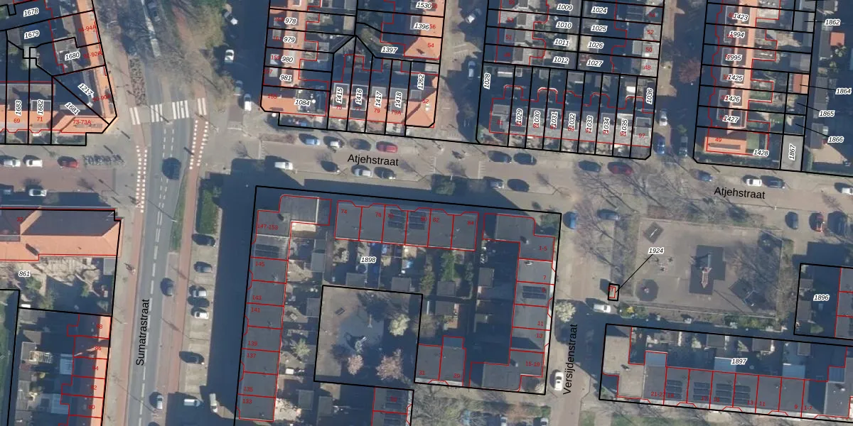 Het perceel waarop Atjehstraat 80 staat heeft een oppervlakte van 3880 m². Dit is een zeer groot perceel. De perceeloppervlakte wordt geregistreerd door het Kadaster. Gedetailleerde informatie over de maten van dit perceel kunt u vinden in het rapport Kadastrale kaart met maatvoering van Atjehstraat 80.