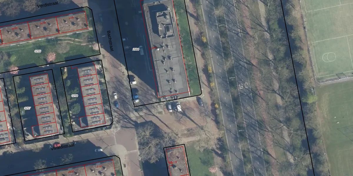 Het perceel waarop Bachstraat 214-A staat heeft een oppervlakte van 2486 m². Dit is een zeer groot perceel. De perceeloppervlakte wordt geregistreerd door het Kadaster. Gedetailleerde informatie over de maten van dit perceel kunt u vinden in het rapport Kadastrale kaart met maatvoering van Bachstraat 214-A.
