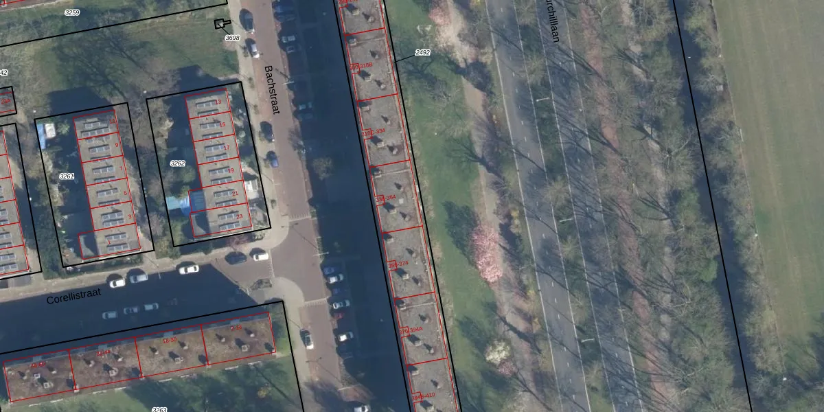 Bachstraat 350 is gelegen op kadastraal perceel LDN01O2492. Deze kadastrale aanduiding is uniek en wordt gebruikt door het Kadaster om eigendomsrechten en andere zakelijke rechten vast te leggen. Het perceel maakt onderdeel uit van de kadastrale gemeente Leiden.
