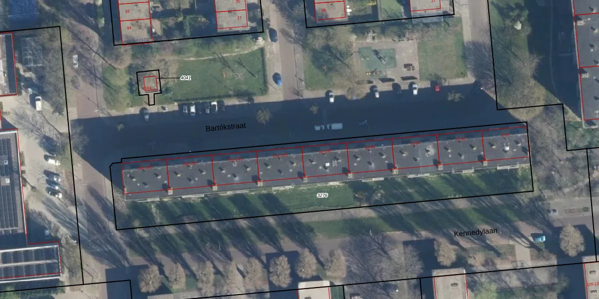 Het perceel waarop Bartókstraat 102 staat heeft een oppervlakte van 3260 m². Dit is een zeer groot perceel. De perceeloppervlakte wordt geregistreerd door het Kadaster. Gedetailleerde informatie over de maten van dit perceel kunt u vinden in het rapport Kadastrale kaart met maatvoering van Bartókstraat 102.