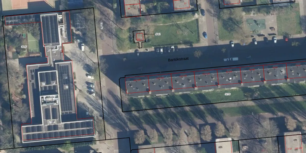 Het perceel waarop Bartókstraat 160 staat heeft een oppervlakte van 3260 m². Dit is een zeer groot perceel. De perceeloppervlakte wordt geregistreerd door het Kadaster. Gedetailleerde informatie over de maten van dit perceel kunt u vinden in het rapport Kadastrale kaart met maatvoering van Bartókstraat 160.