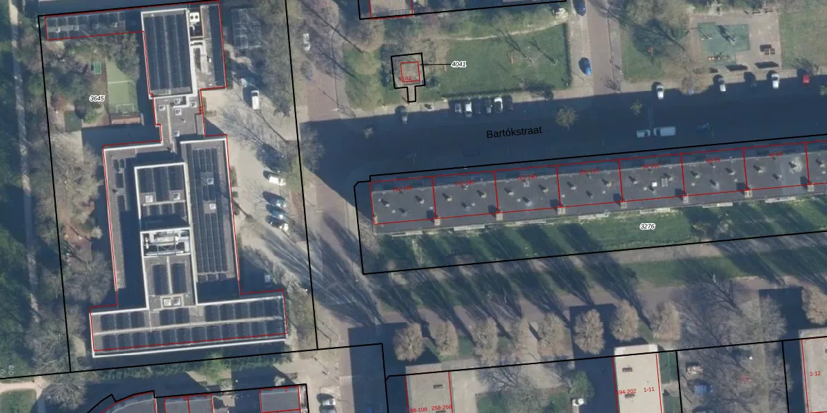 Het perceel waarop Bartókstraat 170 staat heeft een oppervlakte van 3260 m². Dit is een zeer groot perceel. De perceeloppervlakte wordt geregistreerd door het Kadaster. Gedetailleerde informatie over de maten van dit perceel kunt u vinden in het rapport Kadastrale kaart met maatvoering van Bartókstraat 170.