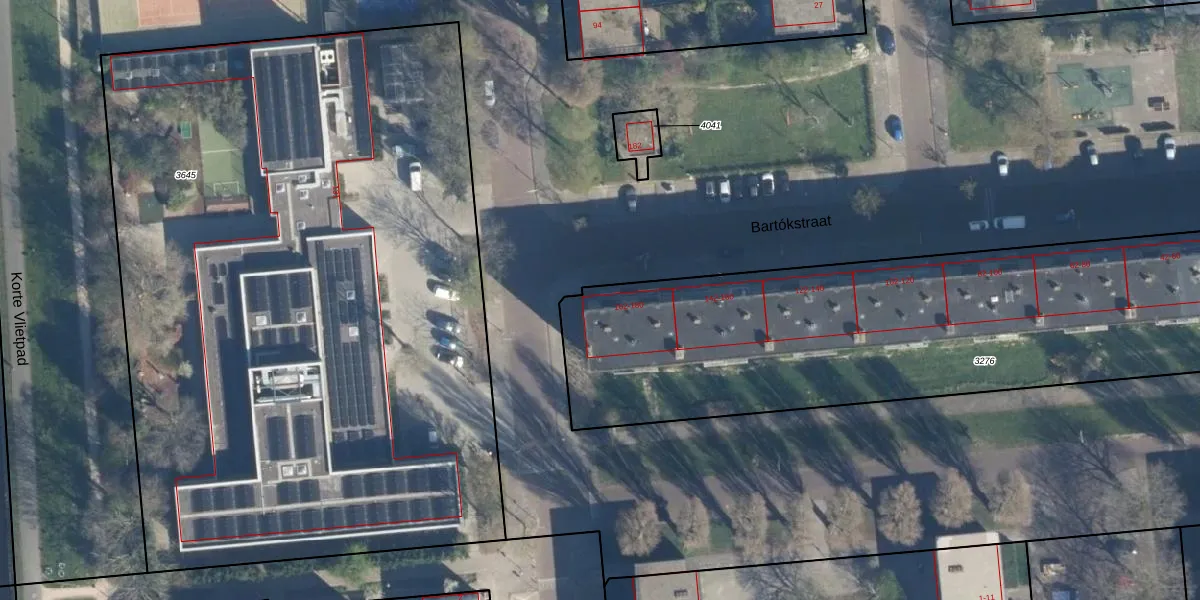Het perceel waarop Bartókstraat 180 staat heeft een oppervlakte van 3260 m². Dit is een zeer groot perceel. De perceeloppervlakte wordt geregistreerd door het Kadaster. Gedetailleerde informatie over de maten van dit perceel kunt u vinden in het rapport Kadastrale kaart met maatvoering van Bartókstraat 180.
