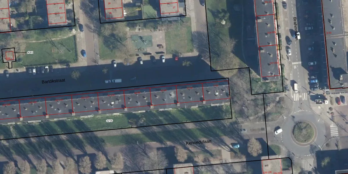 Het perceel waarop Bartókstraat 42 staat heeft een oppervlakte van 3260 m². Dit is een zeer groot perceel. De perceeloppervlakte wordt geregistreerd door het Kadaster. Gedetailleerde informatie over de maten van dit perceel kunt u vinden in het rapport Kadastrale kaart met maatvoering van Bartókstraat 42.