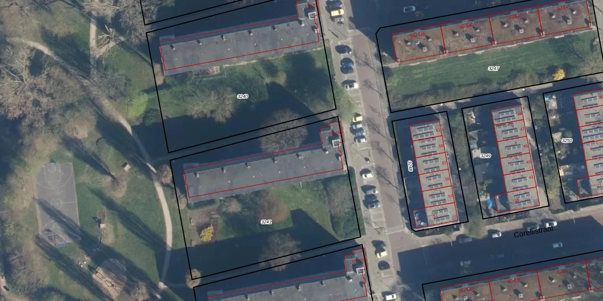 Het perceel waarop het adres ligt is LDN01-O-3241. De afkorting 'LDN01' staat voor kadastrale gemeente Leiden. De gemiddelde perceeloppervlakte in de kadastrale gemeente Leiden is 703,94 m². Dit perceel is met zijn 2325 m² dus groter dan gemiddeld. De grootste perceeloppervlakte in de kadastrale gemeente is 51,8 ha. De kleinste oppervlakte bedraagt 0 m². Er zijn 26 adressen aanwezig op het perceel. De huidige grenzen van het perceel zijn digitaal in de Basisregistratie Kadaster (BRK) geregistreerd op 07-12-2007.